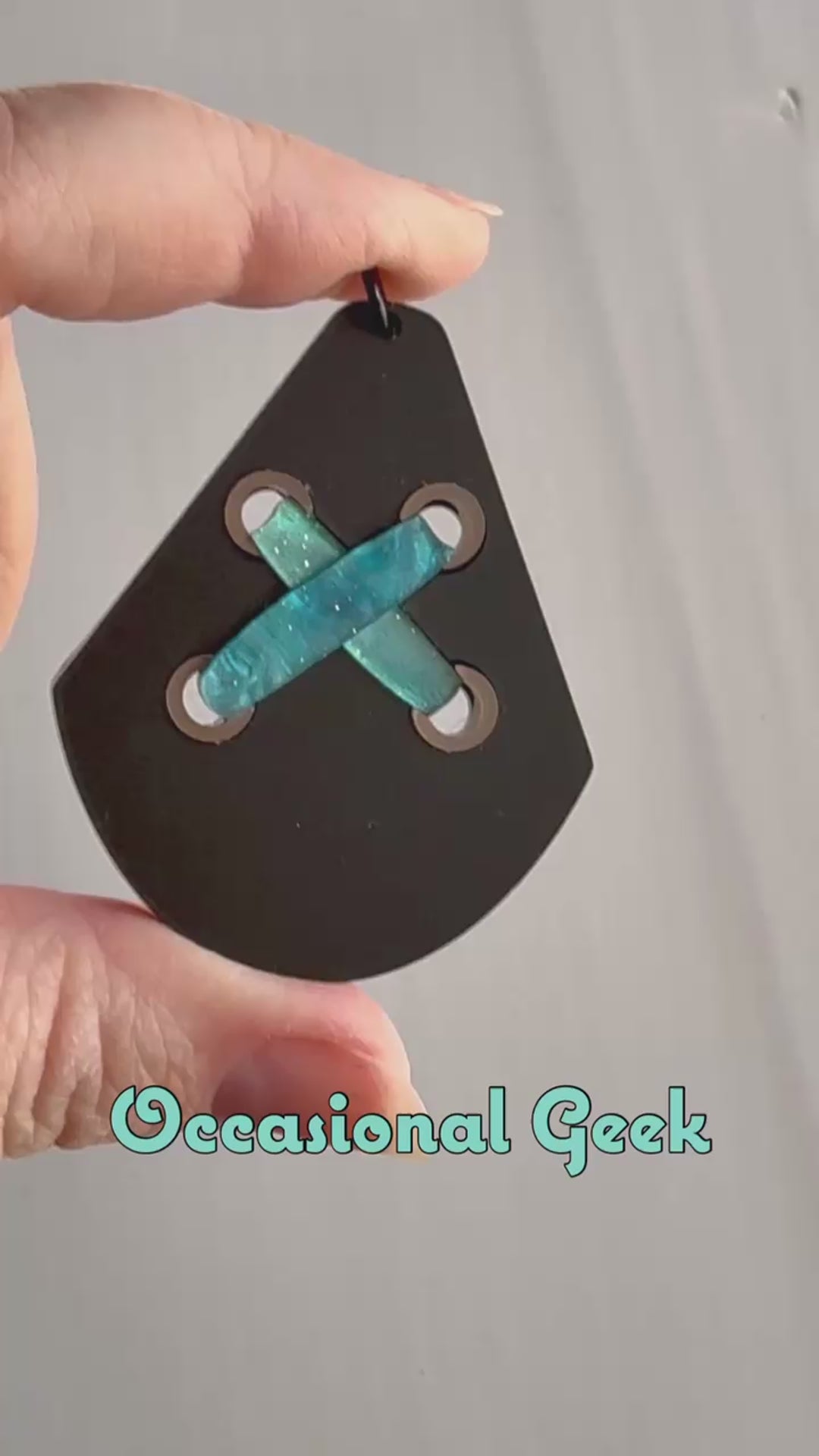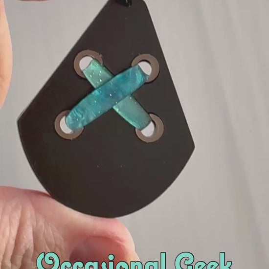 If you have an explosive personality then this Pow Pow Statement Pendant is for you! Inspired by Jinx from Arcane, this teardrop pendant is made of matte black acrylic inlaid together with metalic bronze and marbled blue/green acrylics, with black glossy acrylic on the back, all laser cut to perfection and assembled by hand.