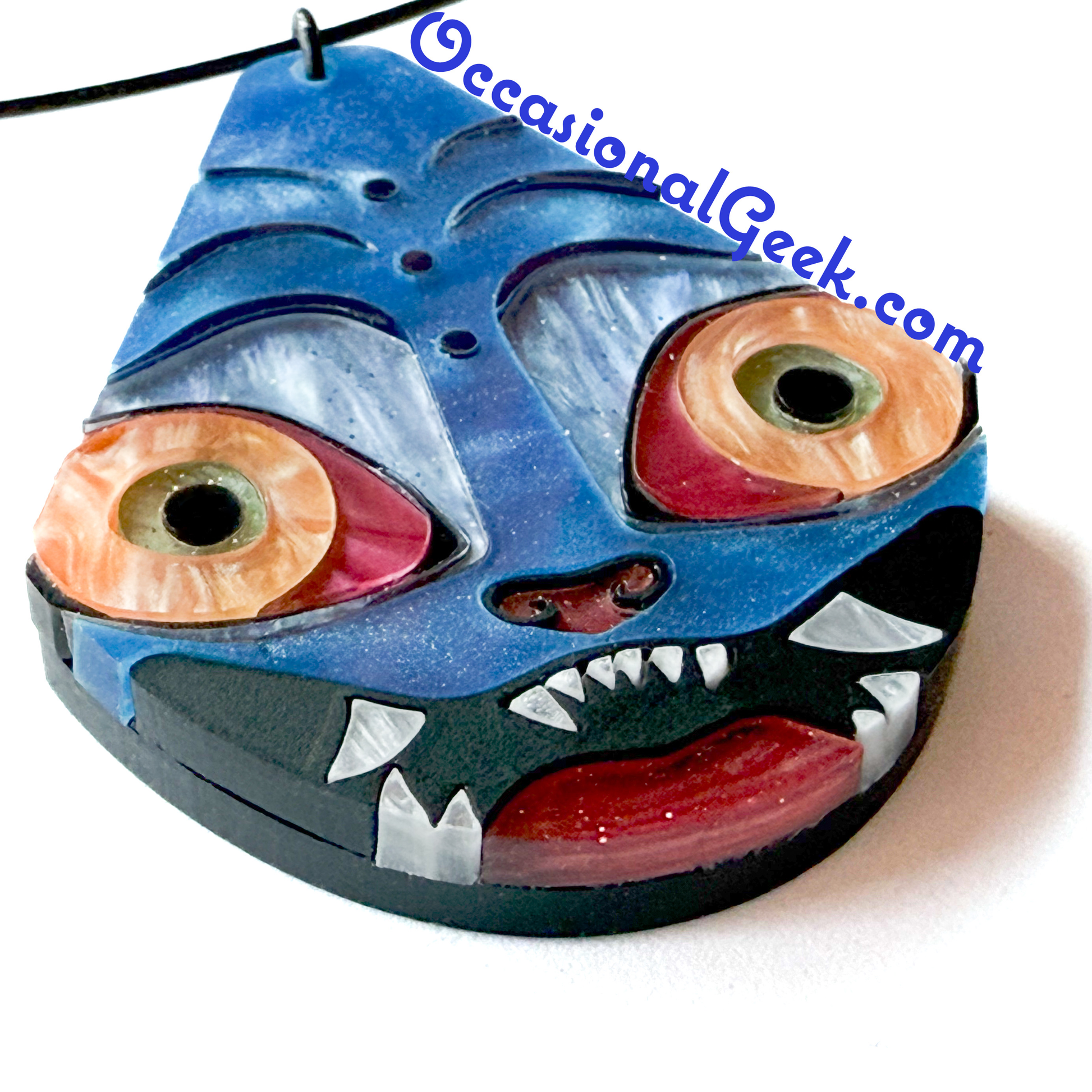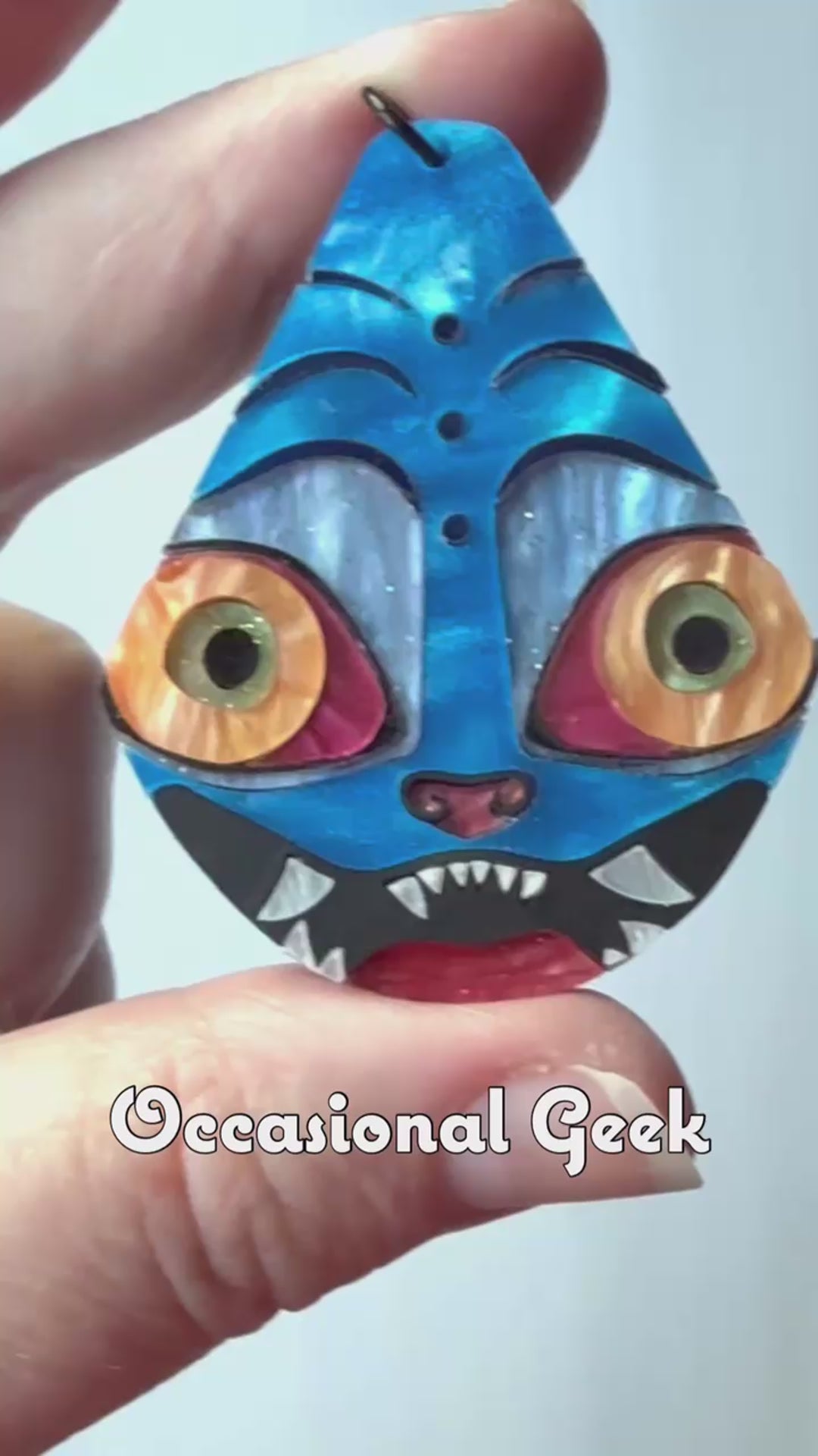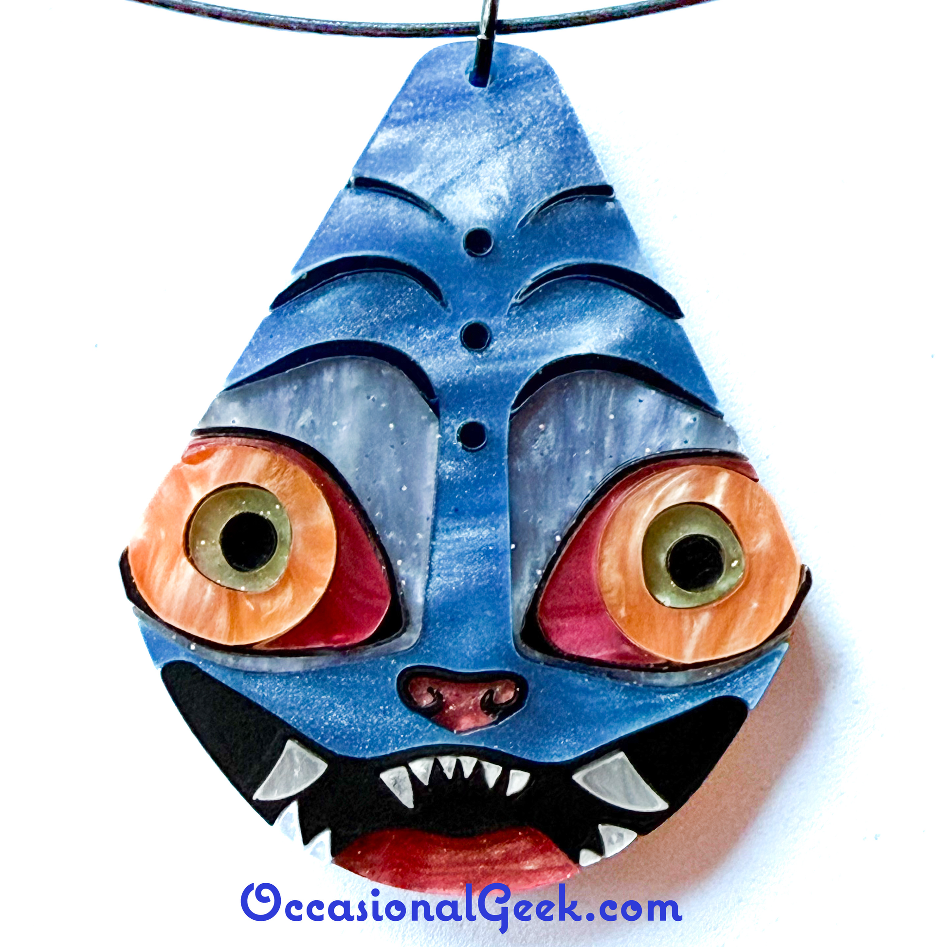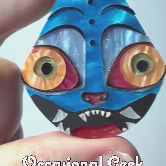 Let's just be real, how can you not love this adorable Derpy face! If you need his adorable face with you throughout the day this Derpy Statement Pendant inspired by the Tiger from KPop Demon Hunters is for you! This teardrop pendant is made of blue marbled acrylic inlaid together with metalic blue, marbled pink, orange, pale green, red, white, black and pale blue and marbled blue/green acrylics, with metallic blue acrylic on the back, all laser cut to perfection and assembled by hand.