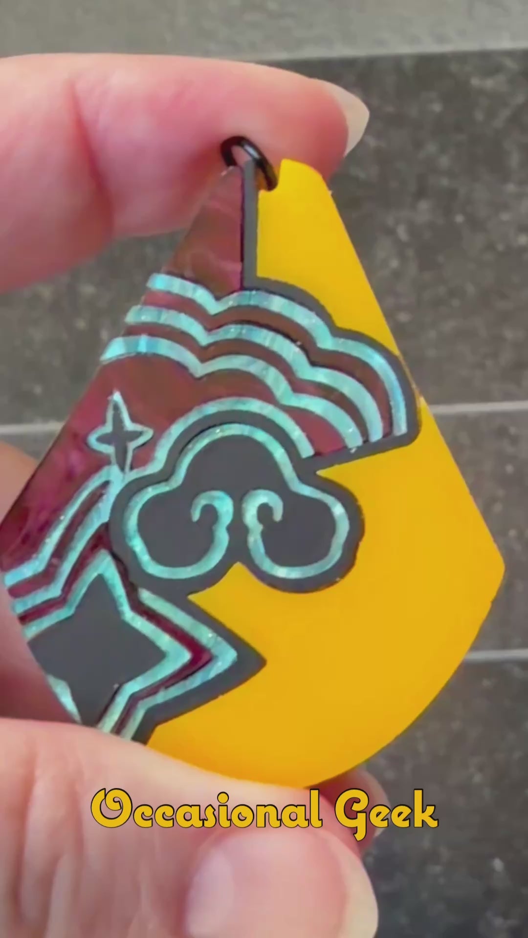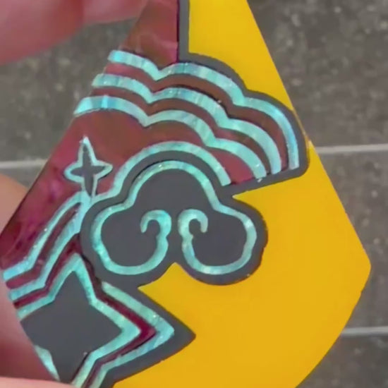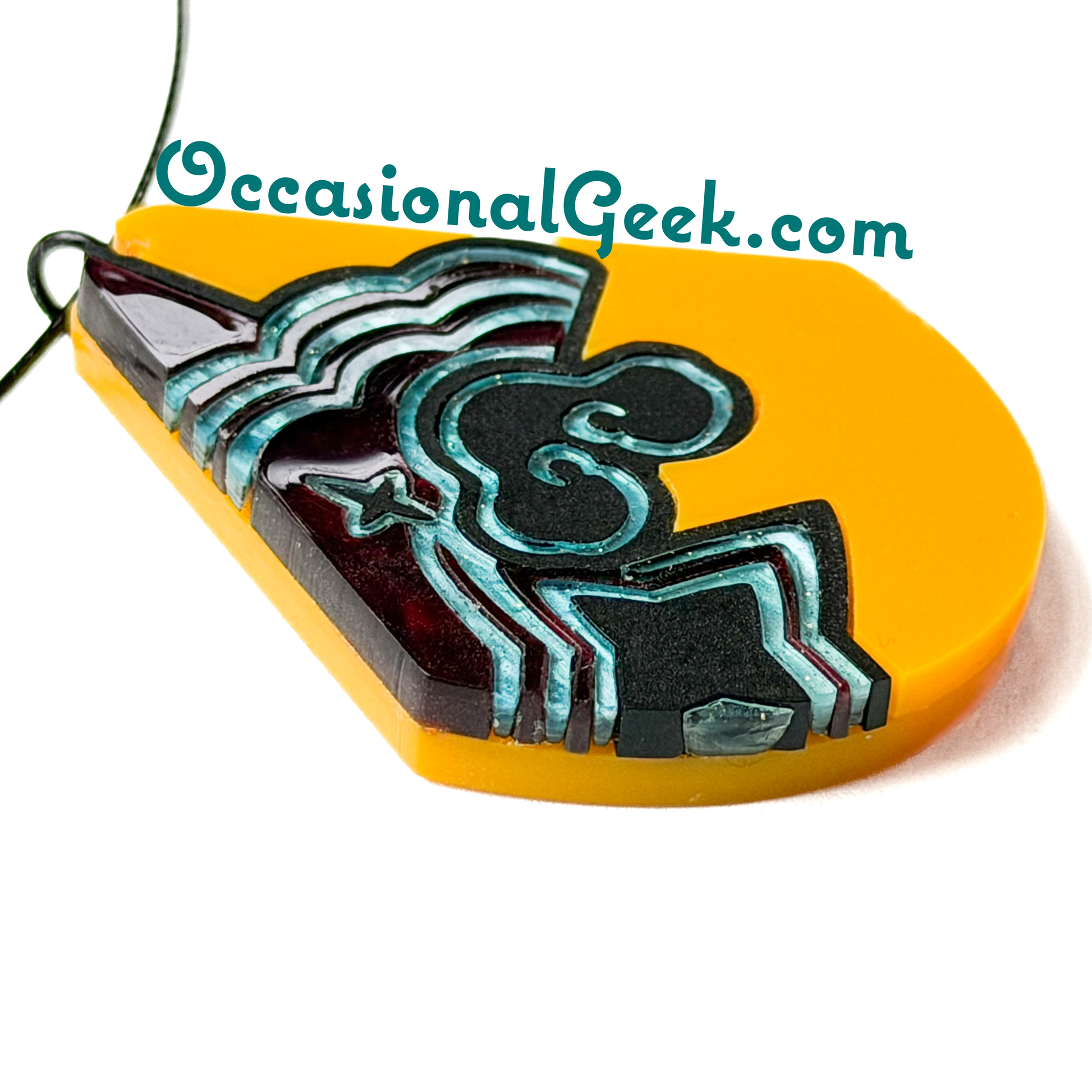 If you are trying to step into the role of the queen you have always been meant to be, then this Golden Queen Statement Pendant inspired by Rumi from KPop Demon Hunters is for you! This teardrop pendant is made of yellow matte acrylic inlaid together with matte black, marbled burgandy and teal acrylics, with matte yellow acrylic on the back, all laser cut to perfection and assembled by hand.