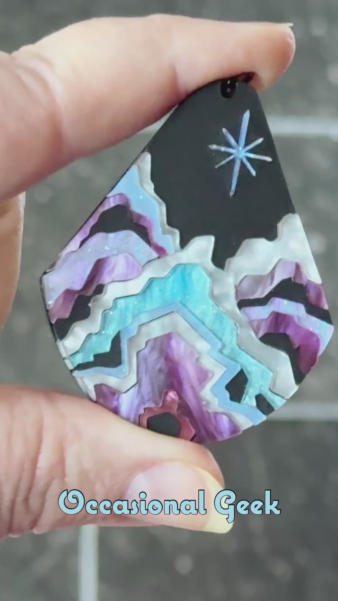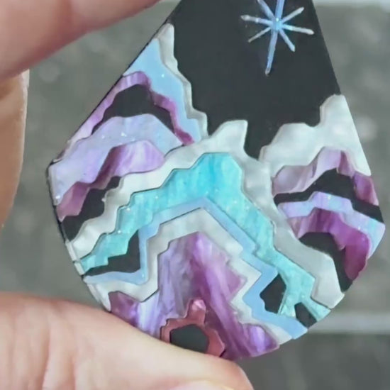 If your wild side used to get you in trouble, but now its part of what makes you great, then this Wild Child Statement Pendant inspired by Mira from KPop Demon Hunters is for you! This teardrop pendant is made of black matte acrylic inlaid together with marbled purple, blue, white and irredescent acrylics, with black acrylic on the back, all laser cut to perfection and assembled by hand.