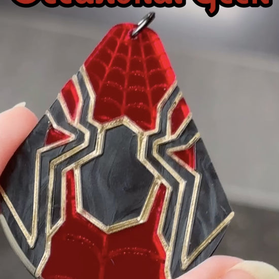Suit up, add a dash of nanotechnology and some Stark inginuety and suddenly your friendly neighborhood Spider-man is Iron Spider and ready! This Iron Spider Statement Pendant is the prefect way to show off your love of Peter and his new adventures. The teardrop is made of black marble inlaid with mirrored gold and red acrylics, all laser cut to perfection and assembled by hand.