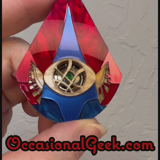 If you are ready to "walk the streets wearing an infinity stone", then this Mystic Sorcerer Statement Pendant, inspired by Doctor Strange, is the perfect statement for you. The teardrop is made of marble and metallic red and blue acrylics inlaid with both marble and mirrored gold acrylics and a green mirrored acrylic in the center, all laser cut to perfection and assembled and painted by hand.