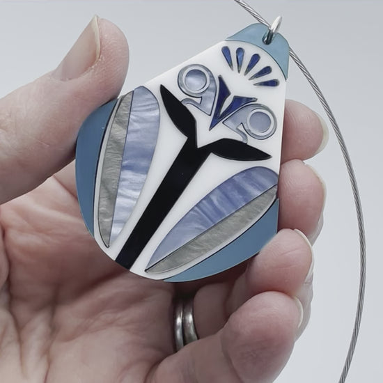 If you are ready to unite and lead Mandalore, then this Nite Owl Statement Pendant, inspired by Star Wars, is the perfect statement for your quest for the Dark Saber. The teardrop is made of a textured matte white acrylic inlaid with pearlescent silver and blue acrylics as well as blue metallic acrylic, all laser cut to perfection and assembled by hand.