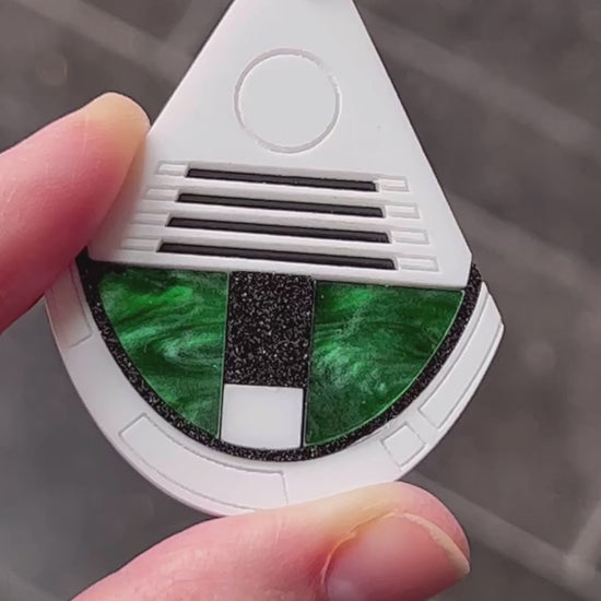 A long time ago in a galaxy far, far away a little droid woke up, spoke and stole our hearts. This "No Thank You!" Bot Statement Pendant, inspired by D-0 from Star Wars, is the perfect for your next droid inspired bound or just everyday look. The teardrop is made of a textured matte white acrylic inlaid with fine black glitter and green marble acrylics, all laser cut to perfection and assembled by hand.
