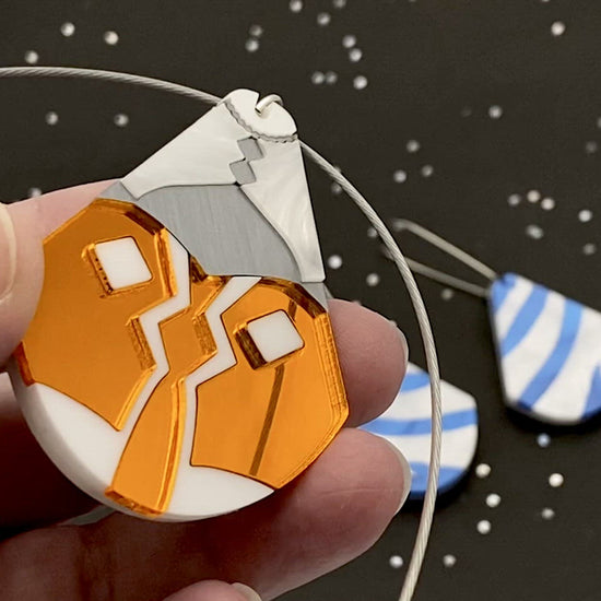 The Padawan Snips Statement Pendant is the perfect statement to help take down the Separatists. This teardrop pendant is made of pearlescent, glossy and matte white acrylics, orange mirrored acrylic and gun metal metallic acrylic, all laser cut to perfection and assembled by hand.