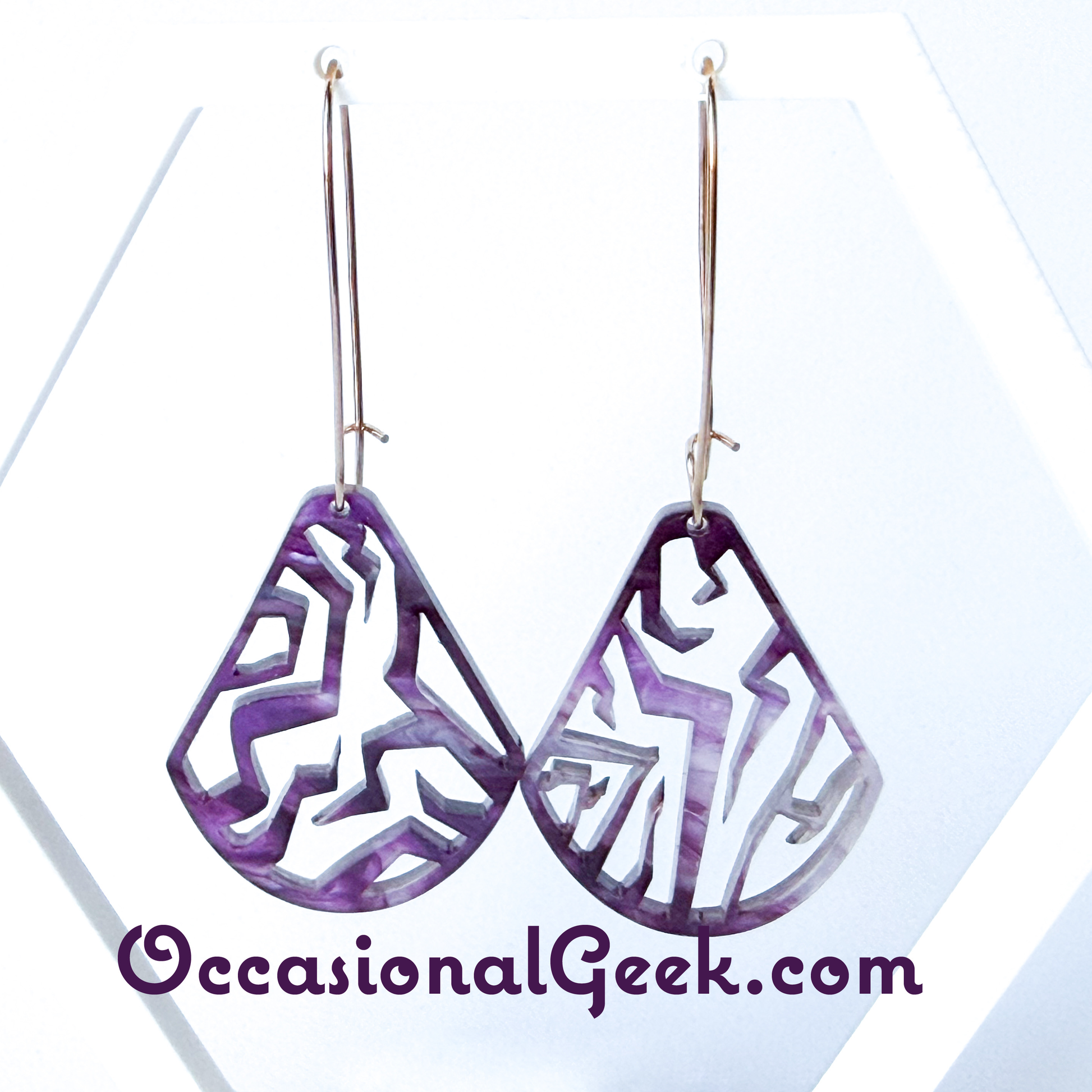 Don't hide your patterns, show them off with these Patterns Dangle Earrings inspired by the Rumi from KPop Demon Hunters! These teardrop earrings are made of your choice of three acylic options. Marbled purple/silver, marbled purple/blue with glitter and irresdescent white.
