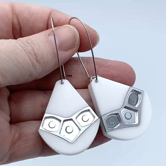 A long time ago in a galaxy far, far away a Rebel Princess lead us down a path of hope. These Rebel Princess Dangle Earrings, inspired by Star Wars, are the perfect statement for helping to lead a rebellion against the empire. The teardrop is made of a textured matte white acrylic inlaid with metallic silver and silver mirrored acrylics, all laser cut to perfection and assembled by hand.