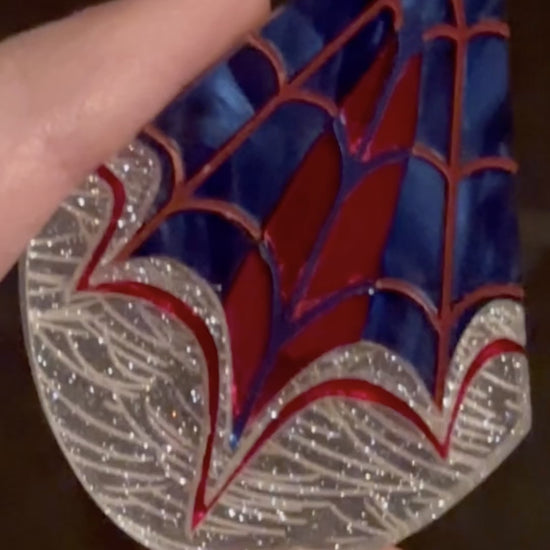 The Spider Princess Statement Pendant is the perfect accessory for anyone who loves to sing their way through life, and chat with their spider friends while taking out bad guys! The teardrop is made of blue and red metallic acrylic inlaid with red mirrored and blue marbled acrylic plus back engraved sparkle clear acrylic at the bottom, all laser cut to perfection and assembled by hand.