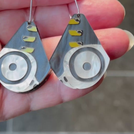 Our favorite bird who has all our favorite looks! If you like to steal your tiger friend's hat, then this Sussie Dangle Earrings inspired by the Magpie from KPop Demon Hunters is for you! These teardrop earrings are made of dark grey and white marbled acrylics inlaid together with metalic gold, and black/white layered acrylics, with dark grey marble acrylic on the back, all laser cut to perfection and assembled by hand.