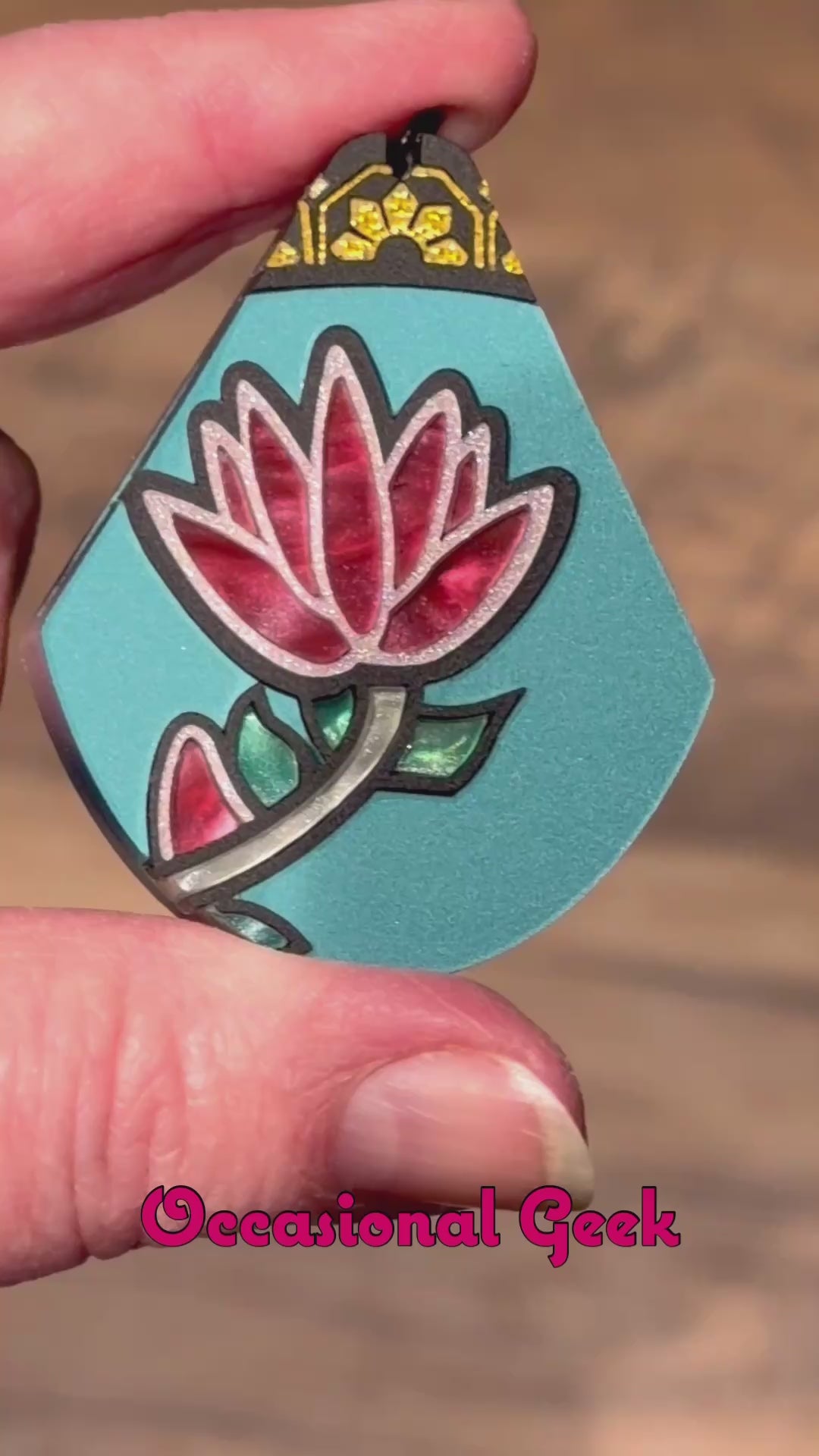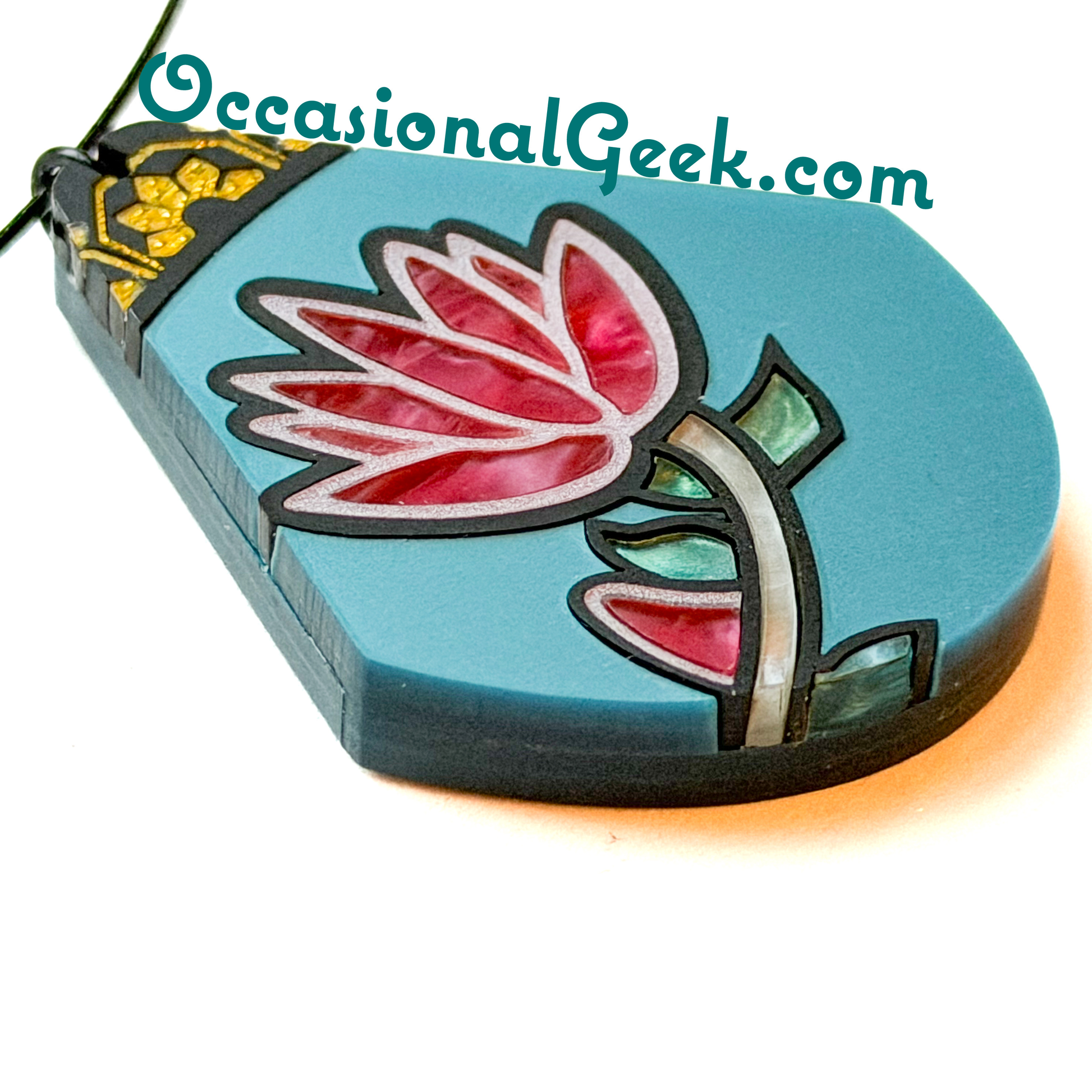 Are you turle obsessed, down for anything that your besties need all while laying down the sickest beats? If so then this Cutest Rapper Statement Pendant inspired by Zoey from KPop Demon Hunters is for you! This teardrop pendant is made of teal metallic acrylic inlaid together with matte black, marbled pink, green, pale shimmering pink and gold thread acrylics, with metallic teal acrylic on the back, all laser cut to perfection and assembled by hand.